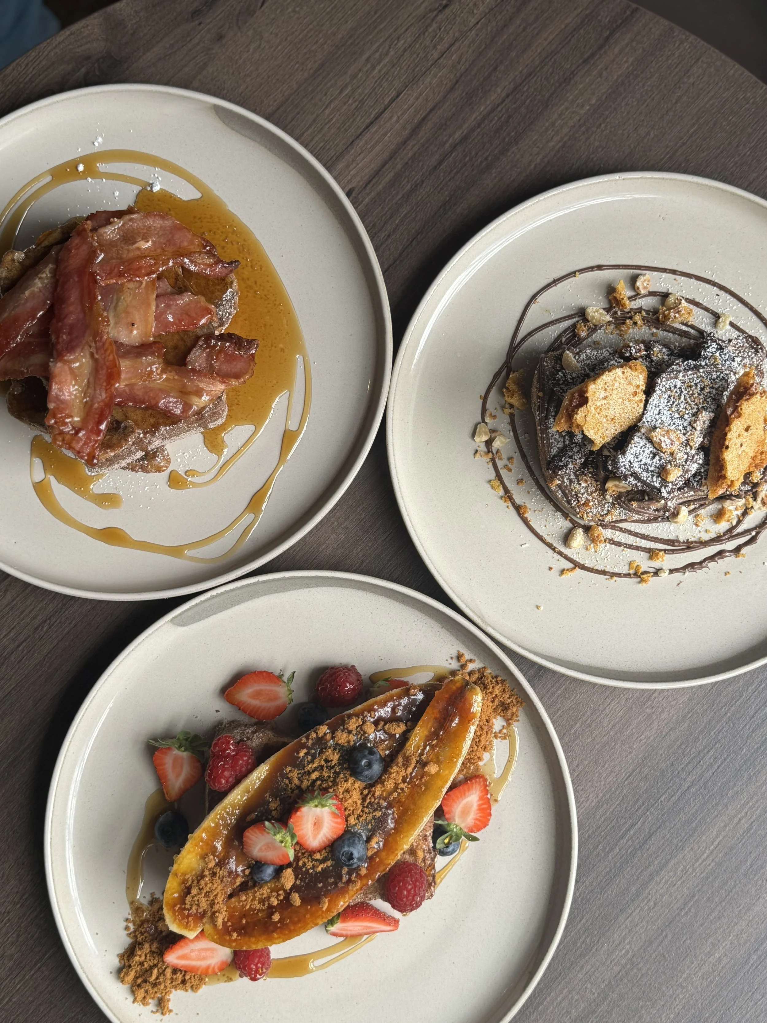 4. Plating up | Once the French toast is cooked, place two slices into a bowl and dust with a mixture of castor sugar and cinnamon ( 90% castor sugar 10% ground cinnamon mixed ) place the French toast on a serving plate. Top with the two slices of the caramelized bananas, followed by 2 spoons of Biscoff crumble , a vibrant mix of raspberries, strawberries, and blueberries. Finally, drizzle with maple syrup for that perfect touch of sweetness.